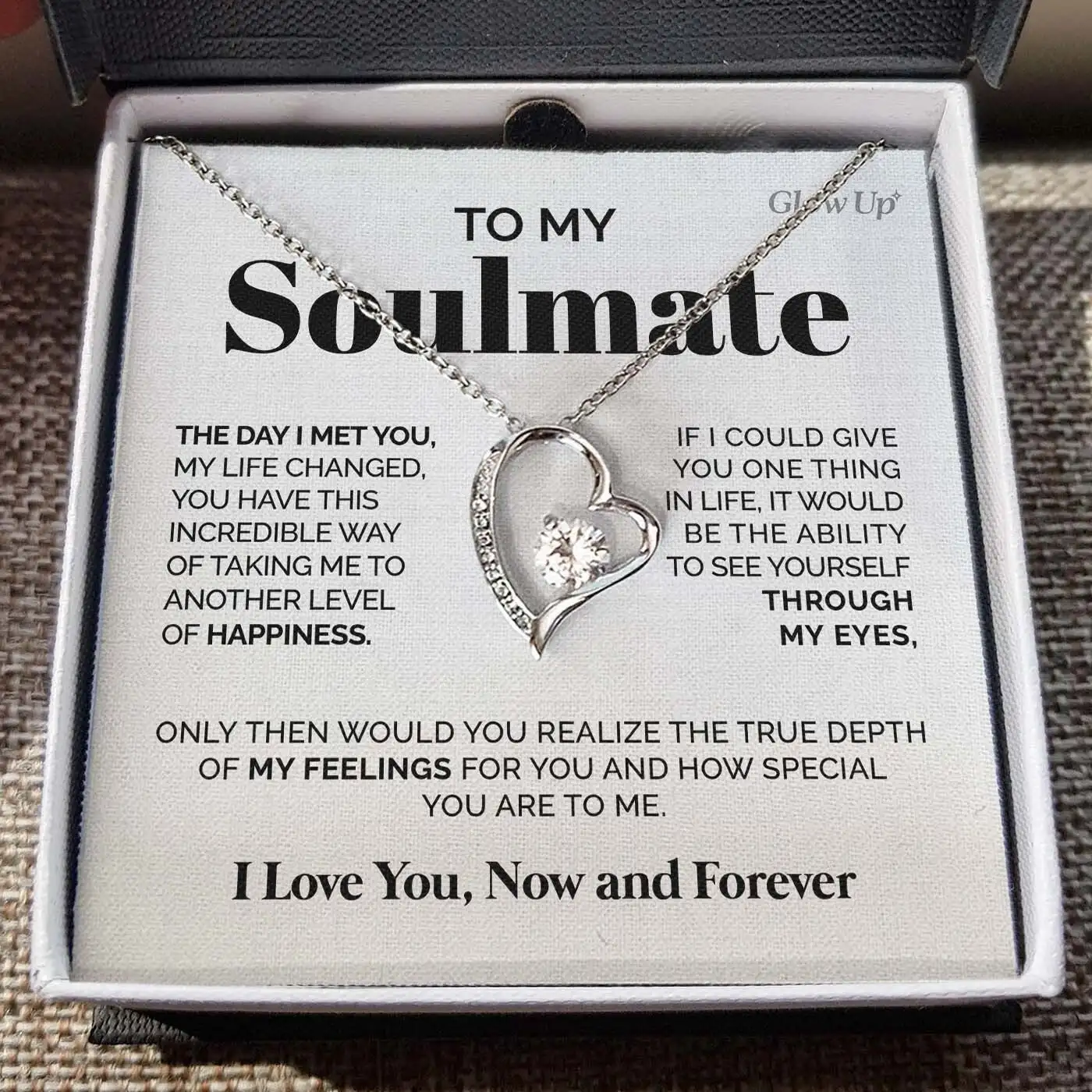 The “To My Soulmate” Heart Pendant Necklace is a beautifully crafted symbol of love, connection, and devotion — designed to be worn close to the heart and cherished for years to come. Featuring an elegant open-heart design with a brilliant center stone, this necklace captures the feeling of seeing yourself through the eyes of someone who truly loves you.