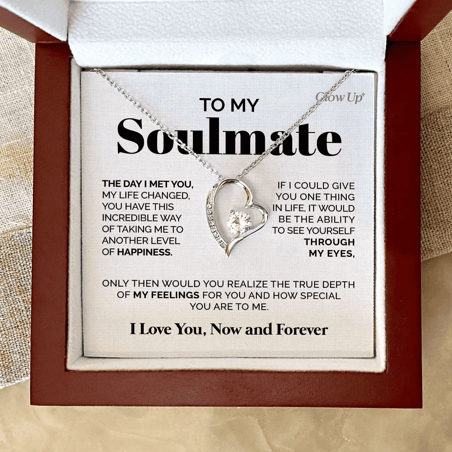 The “To My Soulmate” Heart Pendant Necklace is a beautifully crafted symbol of love, connection, and devotion — designed to be worn close to the heart and cherished for years to come. Featuring an elegant open-heart design with a brilliant center stone, this necklace captures the feeling of seeing yourself through the eyes of someone who truly loves you.